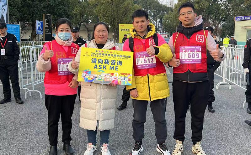 朝6時、赤いベストを著用した金鶏湖マラソンのボランティアは會場で待機していた。劉剣さんと仲間たちは「私にお問い合わせください」と書かれた看板を掲げ、明るい笑顔で入場者に道の案內(nèi)などのサービスを提供した。