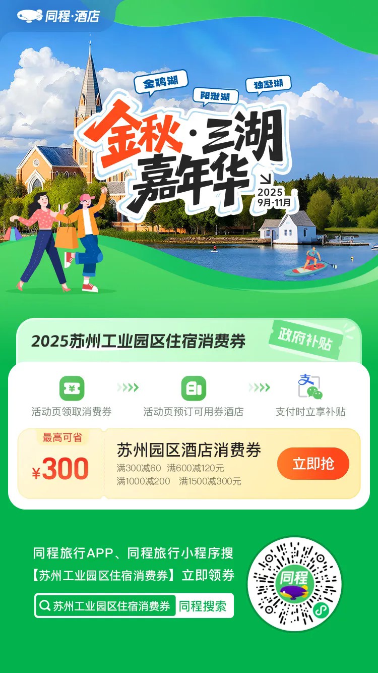 金秋·三湖嘉年華期間,園區聯合同程旅行平臺發放住宿8折消費紅包,中秋、十一都能用。市民游客登錄同程旅行APP或小程序,搜索“蘇州住宿消費券”“蘇州工業園區住宿消費券”“金秋三湖嘉年華”“蘇州”關鍵詞,即可點擊進入消費券專題頁面,一鍵領取住宿文旅消費券。領券后在活動頁預訂可用券酒店,支付時立享補貼,最高可減300元。