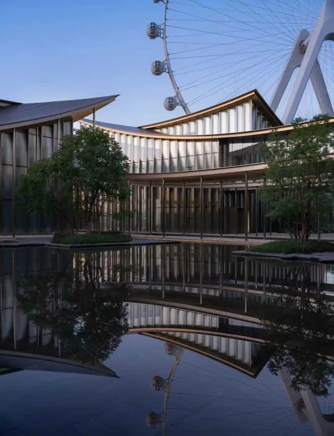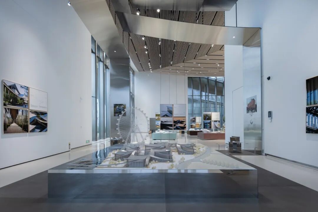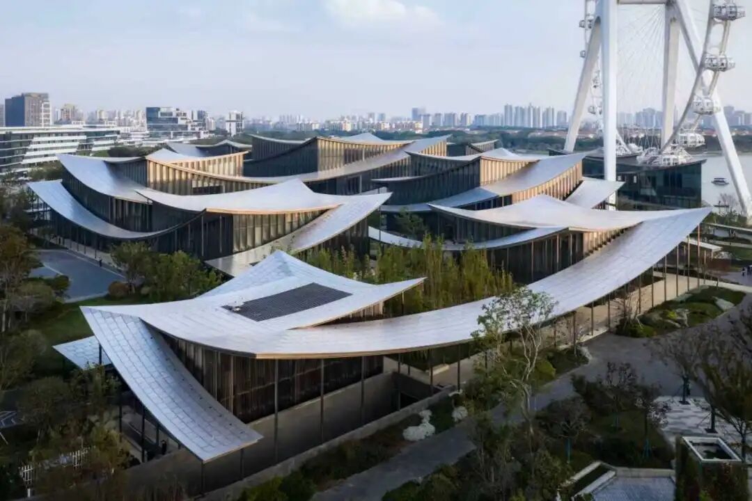 俯瞰整座美術館,絲帶狀屋頂蜿蜒連綿,既是對蘇州園林中“廊”的概念的全新演繹,又巧妙連接起9幢獨棟單體。屋頂的不銹鋼表面和立面的弧形豎向玻璃,又似中國建筑中的琉璃瓦,在陽光下與金雞湖水一起泛動靈動瀲滟之光。一項項匠心巧思讓建筑與景觀交織交融,既具功能性,又有觀賞性,更延展了空間感。