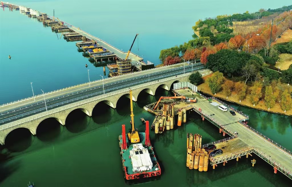通蘇嘉甬高鐵建設(shè)正酣,穿越陽澄湖半島水澤路的水下橋墩施工如火如荼。